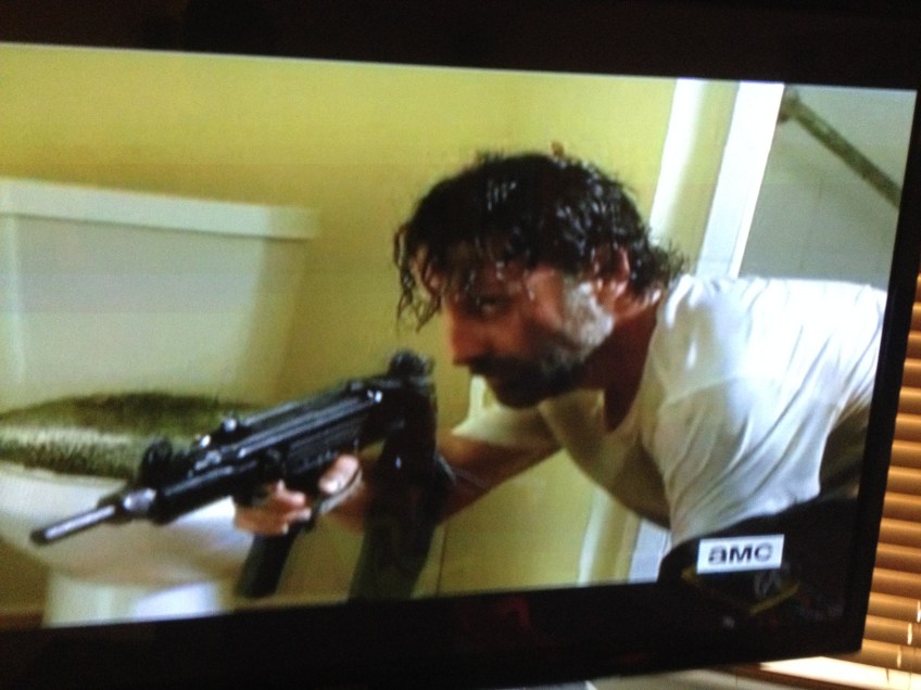 IMG_3179 Published February 26, 2014 at 3264 × 2448 in The Walking Dead, Season 4, Episode 11 “Claimed” As Rick grabs the man’s gun and prepares to go out the bathroom window, he goes back to crack the door of the bathroom open, to set a “walker time bomb” onto the Downstairs Thug Boys once the dead guy reanimates…tactical genius, Rick Grimes-style!