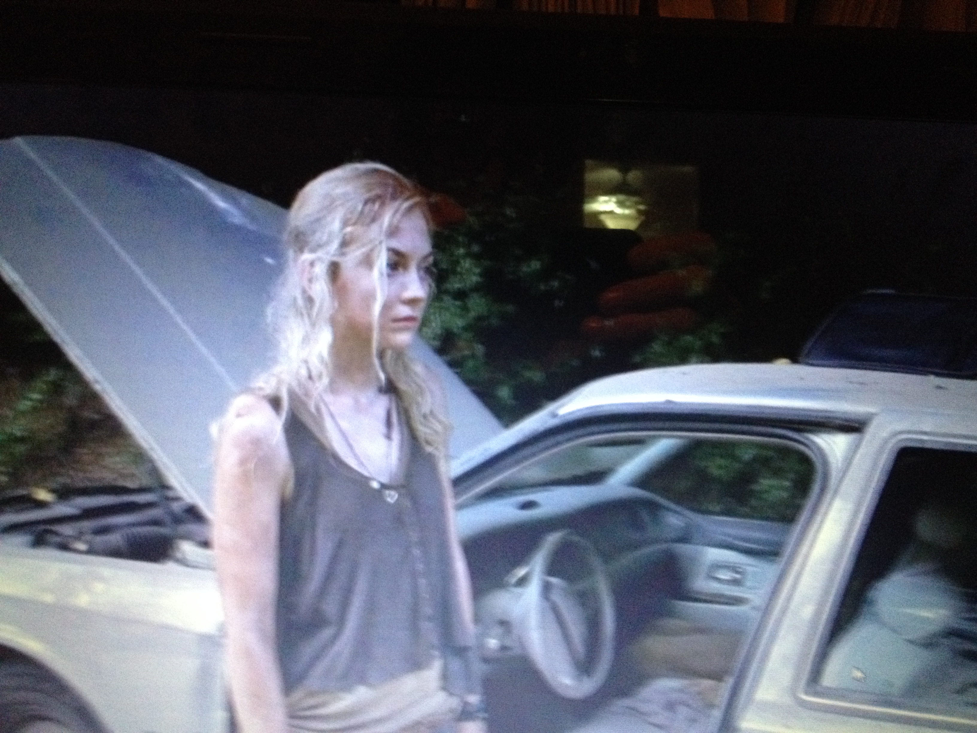 It is a dark and spooky night, and a storm is brewing…the camera pans to an abandoned car. The driver’s side door has been ripped off, the driver’s body spilled out from the car onto the road.  She has been dead a long time.  We hear a rustling from the brush, then we see Daryl, then Beth, emerge from the woods… she runs to the car and tries to start it, to no avail….of course.