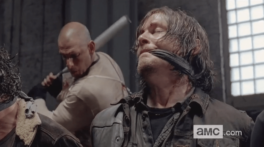 truly terrifying at the scc Published October 12, 2014 at 845 × 471 in The Walking Dead, Season 5, Episode 1, “No Sanctuary” It is a truly terrifying scene, the horror of watching the butchers warming up their swing with the bat and sharpening, wiping their long butcher knives.