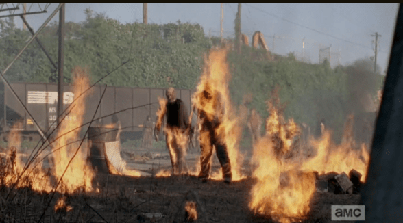 walkers on fire at terminus Published October 16, 2014 at 588 × 326 in The Walking Dead, Season 5, Episode 1, “No Sanctuary”