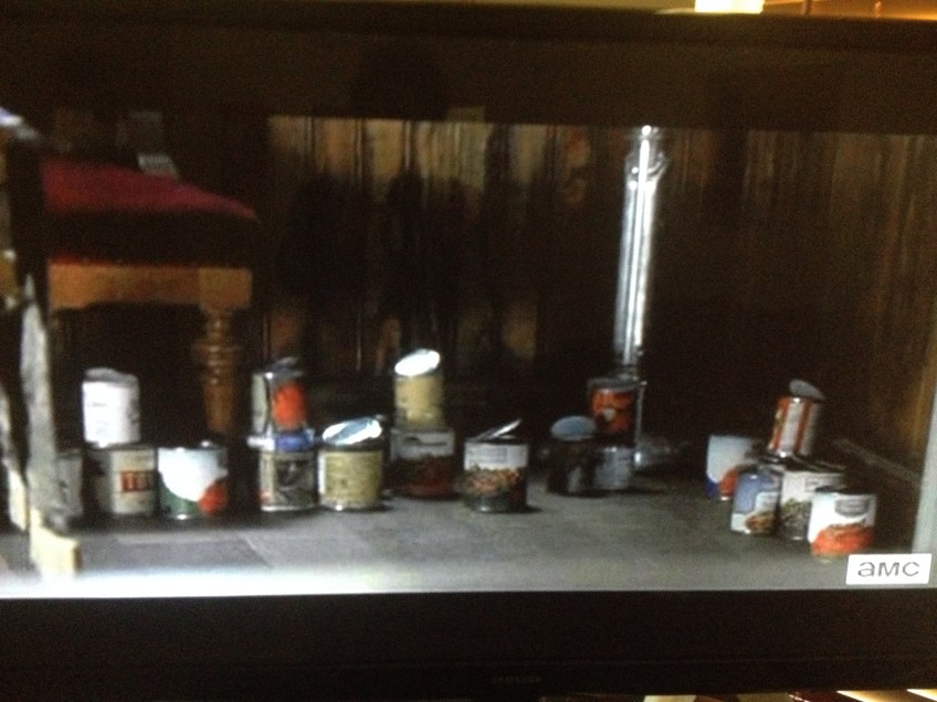 IMG_8644 Published October 25, 2014 at 3264 × 2448 in The Walking Dead, Season 5, Episode 2, “Strangers” At the front altar, Rick finds many opened cans of food, which backs up Gabriel’s story or not leaving the church and being well-stocked from a recent canned food drive, before the turn.