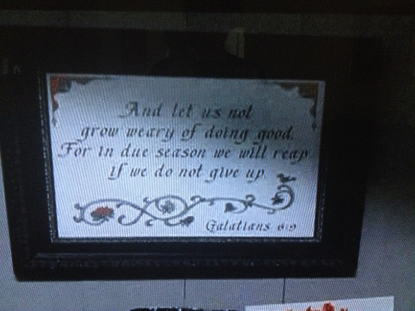 IMG_8646 Published October 25, 2014 at 3264 × 2448 in The Walking Dead, Season 5, Episode 2, “Strangers” In another room, Glenn finds a framed embroidered quote…