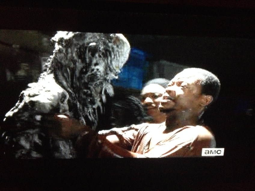 IMG_8678 Published October 25, 2014 at 3264 × 2448 in The Walking Dead, Season 5, Episode 2, “Strangers” The scene between Bob and the Halloween Store Skeleton Walker wasn’t really doing it for me…it kind of just looked like Lawrence Gilliard, Jr., who plays Bob, was just pretending to wrestle a…well, a Halloween store skeleton.