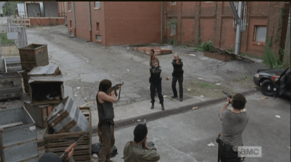 dawns cops are surrounded by rick daryl tyrese sasha Published November 30, 2014 at 593 × 330 in The Walking Dead, Season 5, Episode 7, “Crossed” Looking majorly fine, Deputy Rick Grimes talks the cops down, telling them weapons down, hands up, “We don’t want to hurt you.”