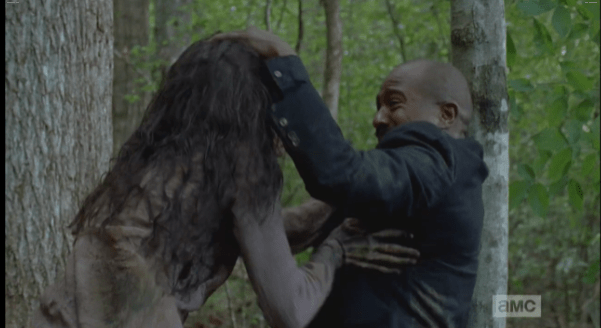 gabriel finds trouble in the woods Published November 30, 2014 at 601 × 328 in The Walking Dead, Season 5, Episode 7, “Crossed” A little ways into the woods, just as Carl predicted, Gabriel finds trouble in the woods, in the form of Walker of the Flock.