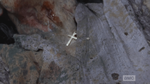 gabriel spots the cross around the walker’s neck Published November 30, 2014 at 582 × 328 in The Walking Dead, Season 5, Episode 7, “Crossed” Gabriel manages to throw the walker off him, and picks up a large rock, ready to smash her head in, then spots the gold cross around the walker’s neck…she may have been one of his parishioners that he locked out of the church…