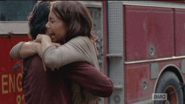 maggie overjoyed at beth news Published December 5, 2014 at 590 × 331 in The Walking Dead, Season 5, Episode 8, “Coda” Maggie, overjoyed at hearing this news, grabs up Glenn in a hug, while Tara says, “Let’s blow this joint and go save your sister!” (Ugh, feeling like I am about to cry, and vomit, rewatching this scene.)