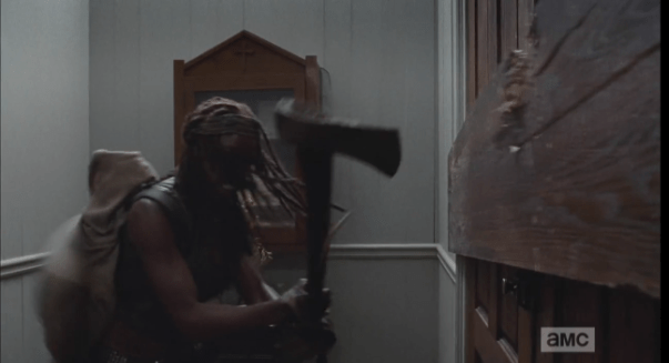 michonne chops at door w baby on her back Published December 3, 2014 at 603 × 327 in The Walking Dead, Season 5, Episode 8, “Coda” Wearing Baby Judith on her back, Michonne looks like the most badass momma ever, chopping at the boarded up church doors with an axe…babywearing, zombie-apocalypse style!