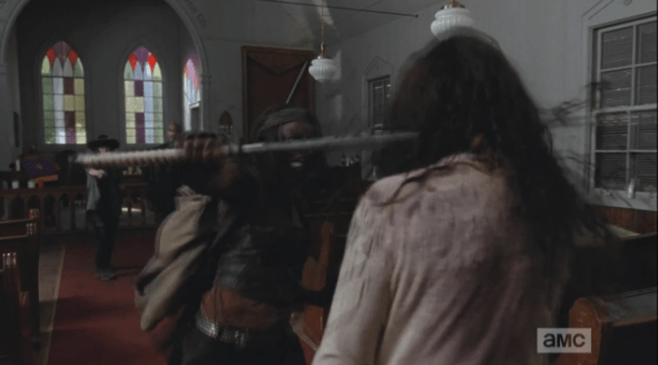 michonne stabs walker in church 2 Published December 3, 2014 at 591 × 328 in The Walking Dead, Season 5, Episode 8, “Coda” …just casting my vote, for the record.