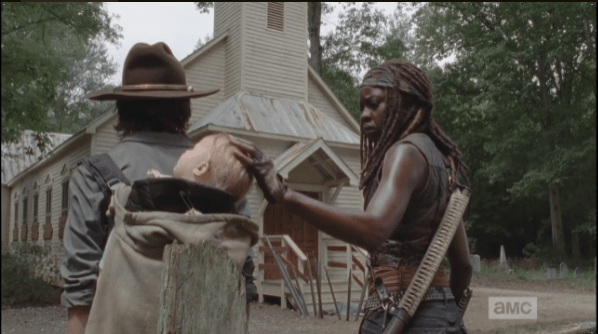 michonne touches judith’s sleeping head Published December 5, 2014 at 598 × 334 in The Walking Dead, Season 5, Episode 8, “Coda” As Gabriel takes a rest, Michonne touches Juith’s sleeping head (and that, my readers, is all a stunt baby should be expected to do…look adorable, and take a nap!).