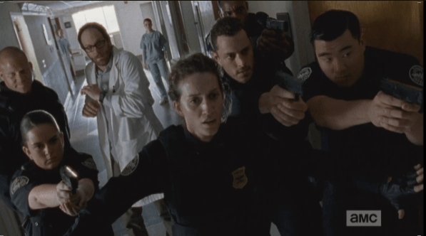 shepherd says hold your fire Published December 6, 2014 at 597 × 332 in The Walking Dead, Season 5, Episode 8, “Coda” As the officers draw their weapons, Shepherd tells them to hold their fire…”It was just about her (Beth), ” she says. “It’s over. Stand down!”