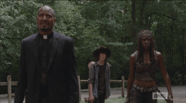 where do we go Published December 5, 2014 at 595 × 330 in The Walking Dead, Season 5, Episode 8, “Coda” As the walkers begin to break down the doors, Gabriel, Michonne, and Carl back up…Carl asks, “Where do we go?” Michonne looks around, trying to come up with a plan, when…