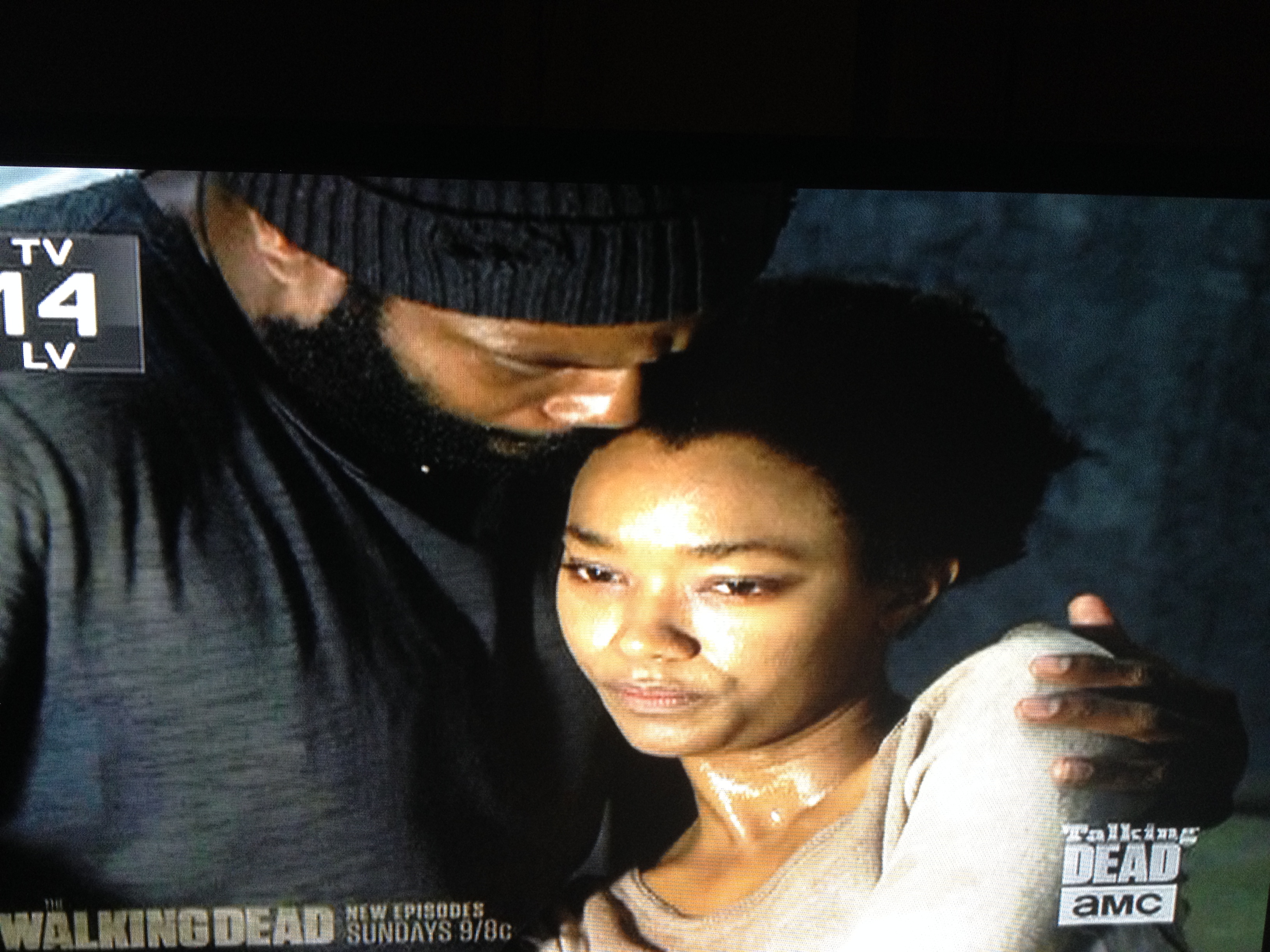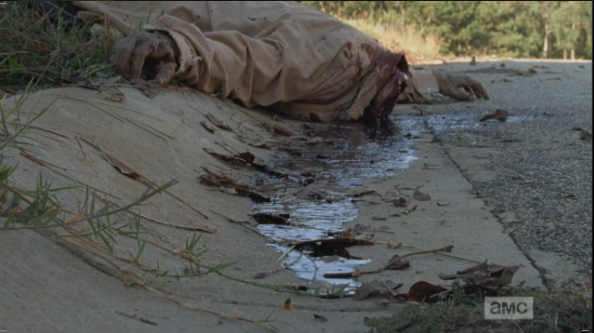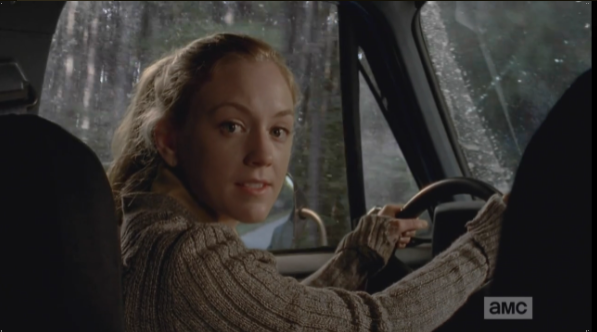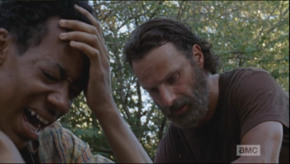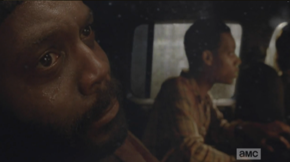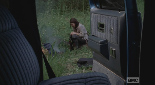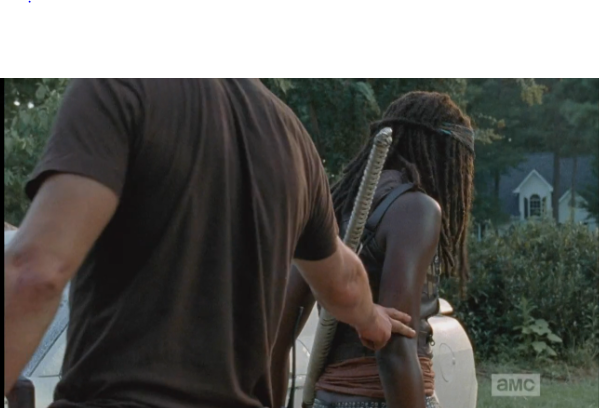 Rick is crouched at the car, talking who-rides-with-whom logistics, then looks up, asks Michonne if she’s ok. (He really is scoring some major bf points in this episode.)