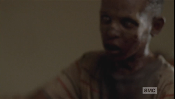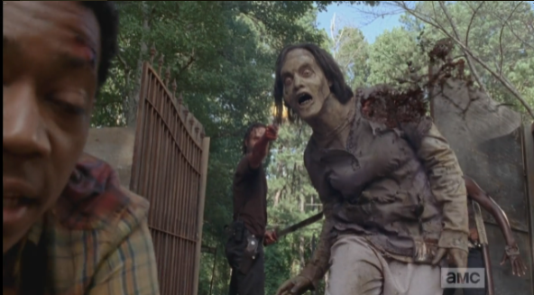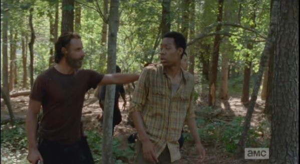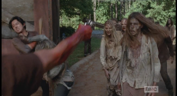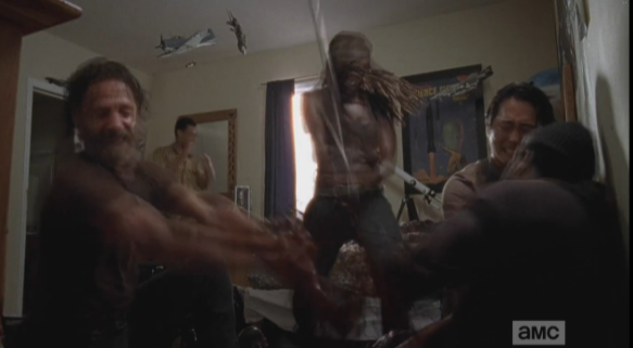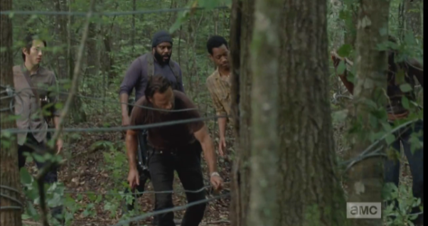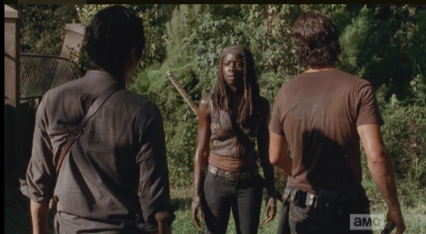 Michonne starts to go after Aaron, and when Rick tries to call her back, she replies that the way to find the others is to go after Aaron. They abandon the car and run into the woods, in the direction that Aaron went, and must engage in some serious walker slaughter. As Michonne slices and dices with her katana, Rick fires upon the walkers, calling to Glenn to clear the way for them (I think that’s what he said).