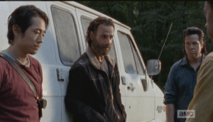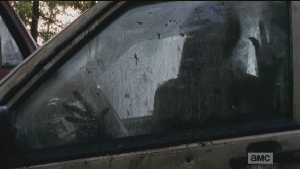 Rick’s first thought is of the RV behind them, but Glenn tells him to stay in the car, that the RV would have seen what was happening and are either behind them, or they were able to get away…