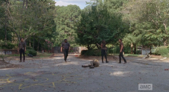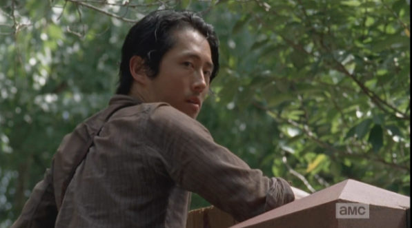 Glenn thinks about it a minute, then, with a shake of his head, he goes to help Aaron, rekilling the walker and cutting Aaron’s hands free. “Run if you want, “ Glenn tells Aaron, “I’ve got other things to worry about.” As Glenn turns to leave, Aaron quotes Glenn’s words to Daryl, the day before, back to him: