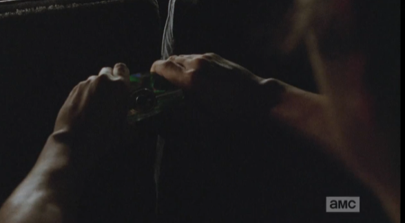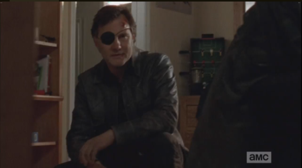 Rick looks at Daryl, who turns to look at the bottles of water on the table, which are indeed the same brand as the bottled water on the road. Daryl whirls back on Aaron, steps towards him. “How long you people been followin’ us?” Daryl growls down at him.