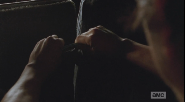 Glenn and Aaron have come to save the day. Aaron holds up his hands, offers for Rick to tie him up again, if he needs to, but please hurry…methinks Aaron secretly is beginning to enjoy this getting tied up business!