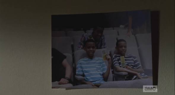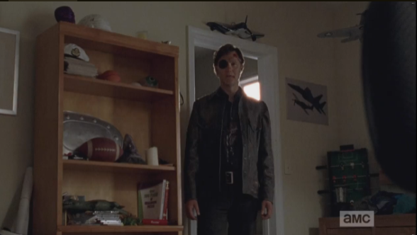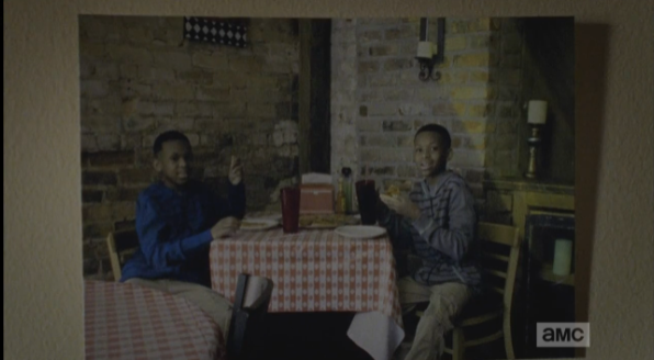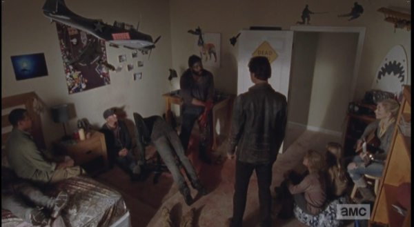 Aaron’s self-satisfied smile of before quickly disappears, and he begins to stammer out some bullshit about how he tried to take a group picture, but the exposure, and then problems with the developing…he’s clearly lying. But why? My first three guesses, right off the top of my head: 1) The people were all shut inside the factory warehouse, mass-producing some product that Alexandria makes and sells to other outside communities, like…license plates, and they only get two 15-minute breaks every 12 hours; 2) Everyone in Alexandria is bound and gagged in their respective gimp closets, except for the dominants who keep watch over them; 3) Alexandria is actually a leper colony, and the inhabitants, while still technically living, are losing flesh and limbs at a rate that rivals the decomposition of the walkers. What’s your guess?