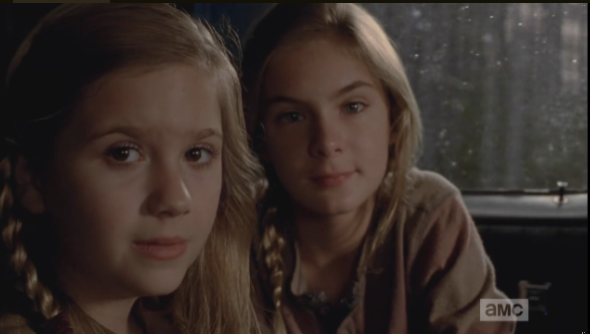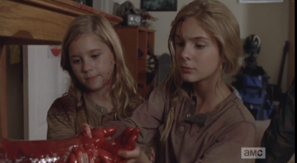 In the opening shot of The Walking Dead’s Episode 11, “The Distance,” we see members of the gang, awake now, sitting on the barn floor. Some of the gang, like Carol, Abraham, and Daryl, are checking, cleaning their weapons, while others, like Rick, and Gabriel, are sitting quietly, alone in their thoughts. Judith is playing quietly on the floor, while Carl is collecting boards, presumably to reinforce the barn, or make a bench, or something.