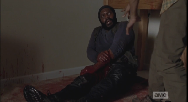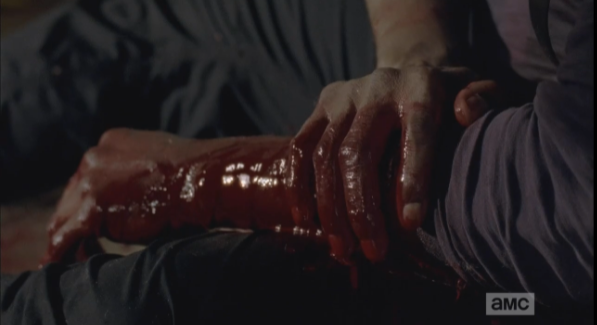 “Sit him up,” Rick orders. Maggie begins to suggest that maybe that’s not the best idea, but Aaron assures her he’s fine. Rick, who doesn’t care either way, says, “He’ll be fine, sit him up.” Michonne’s sitting there, thinking, “I am so annoyed with him right now…but this alpha male thing he’s got going is totally turning my crank right now…damn him!”