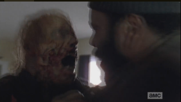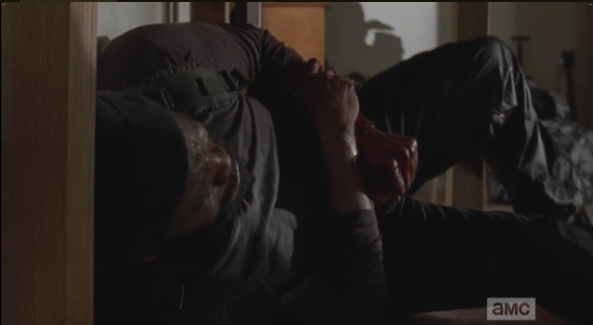 Aaron rushes to Eric and pastes one on him, which made me cheer out loud. Man make-out sesh on prime time television…thank you, TWD!