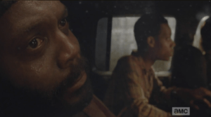 Abraham looks down at the console. The battery light is on. He asks Rosita how long they’ve got, and she says they are halfway there. Abraham smiles, says they are going to make it…