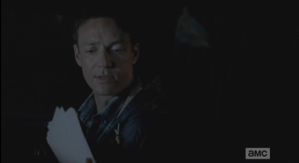 Aaron’s self-satisfied smile of before quickly disappears, and he begins to stammer out some bullshit about how he tried to take a group picture, but the exposure, and then problems with the developing…he’s clearly lying. But why? My first three guesses, right off the top of my head: 1) They were all shut inside the factory warehouse, mass-producing some product that Alexandria makes and sells to other outside communities, like…license plates, and they only get two 15-minute breaks every 12 hours; 2) Everyone in Alexandria is bound and gagged in their respective gimp closets, except for the dominants who keep watch over them; 3) Alexandria is actually a leprosy colony, and the inhabitants, while still techinically living, are losing flesh and limbs at a rate that rivals the decomposition of the walkers. What’s your guess?