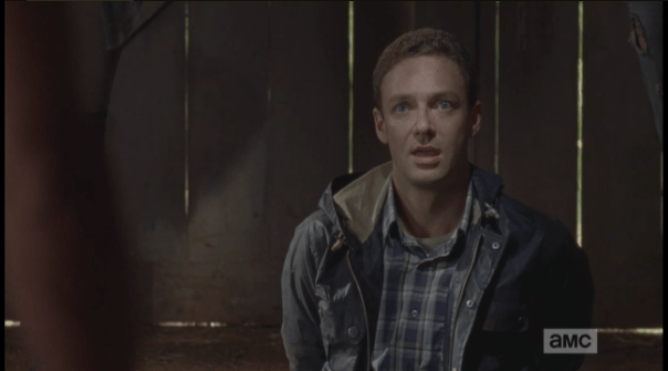 aaron protests Published February 27, 2015 at 604 × 335 in The Walking Dead, Season 5, Episode 11, “The Distance” “Rick,” Aaron protests, “If I wanted to ambush you, I would do it here…light the barn on fire, pick you off as you ran out the only exit…” Another good point by Aaron.