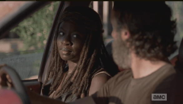 at the gate 5 rick looks at michonne Published February 28, 2015 at 586 × 333 in The Walking Dead, Season 5, Episode 11, “The Distance”