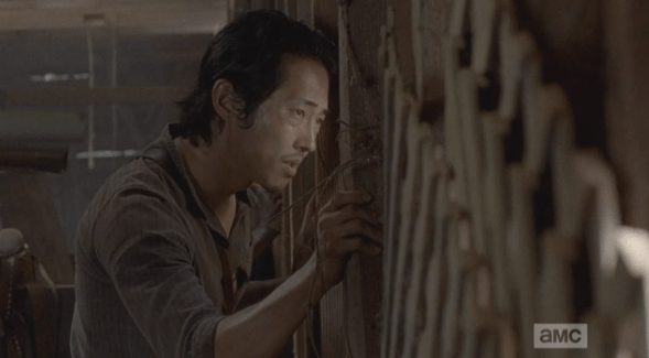 glenn keeps looking Published February 27, 2015 at 589 × 325 in The Walking Dead, Season 5, Episode 11, “The Distance” “Keep looking, ” Rick In Charge barks, and Glenn turns back to his post, looking so weary at this point.