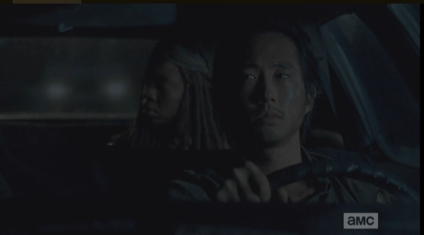 glenn looks back at aaron Published February 28, 2015 at 599 × 332 in The Walking Dead, Season 5, Episode 11, “The Distance” As Glenn listens, and waits, for Aaron to answer…