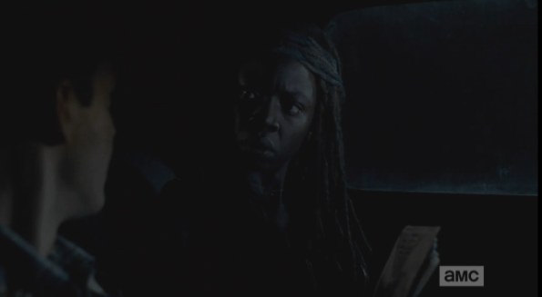michonne asks why no pics of your people Published February 28, 2015 at 595 × 327 in The Walking Dead, Season 5, Episode 11, “The Distance” Michonne, alarmed, looks up, asks Aaron why he doesn’t have any pictures of his people?