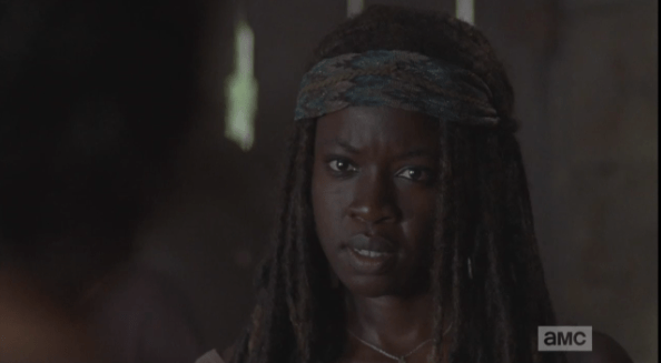 Michonne counters, “We do. You know what you know…you’re sure of it. I’m not.” Rick regards Michonne, has no ready reply. (Watching this, I was thinking, “Man, she is so good for him!” Michonne is strong enough to stand up to Rick, but she’s cool enough to do it respectfully, and not make him feel like a dick for just wanting to protect his people. Richonne is some mad sexy when they butt heads! I kept wanting them to take it to the barn floor, and wrestle it out.