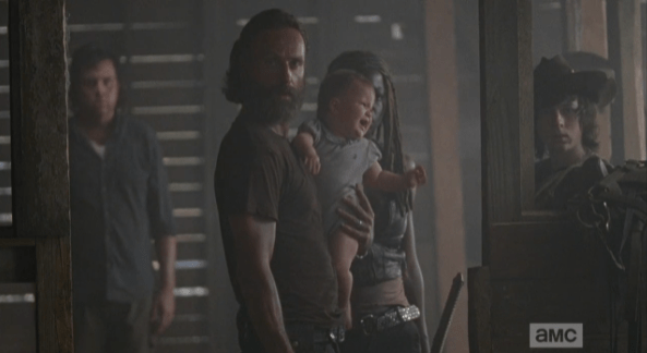 As the barn door is closed behind him, Aaron looks nervously, in thanks, towards Maggie, and then towards Rick and the group, who stand and face him silently, weapons drawn. “Hi,” he manages, and at the sound of a stranger’s voice, Judith begins to cry. Papi Grimes fixes Aaron with this withering look, before handing the baby over to Carl. Uh oh, Aaron, the baby doesn’t like you…and neither does Papi Grimes. Off to a bad start, buddy.