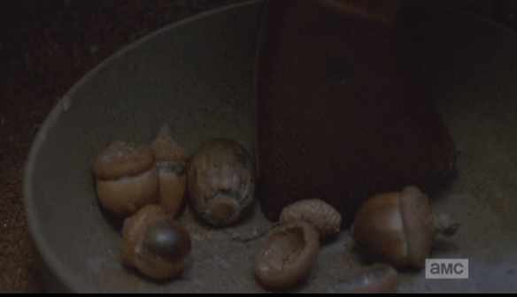 rick is trying to crush acorns Published February 28, 2015 at 584 × 336 in The Walking Dead, Season 5, Episode 11, “The Distance” Yuck. I have read that while acorns are certainly edible, and can be crushed to make a meal, or a flour, that they are extremely bitter, and must be soaked in water for a long, long time to leach the bitterness out.