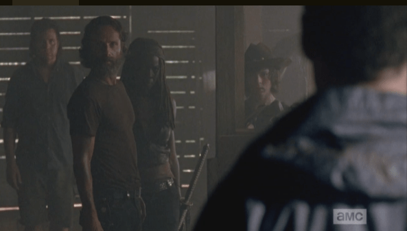 Rick, making no move to reply to Aaron’s greeting, regards the stranger a moment more before asking, hoarsely, “You say he had a weapon?” As Aaron tries to not pee his pants (and I tried not to swoon over how hot Rick-In-Charge was being during this whole exchange),