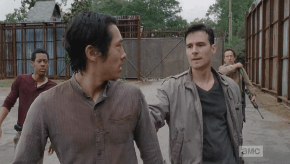 Aidan charges up behind Glenn, reaches out and stops him, “Hey…hey! Look, we got a way of doing things out there…” “You tied up walkers!” exclaims Glenn, still incredulous at the sheer risk and stupidity of such a mindset. “He killed out friend!” Aidan yells. No, Aidan, you fucking killed your friend.