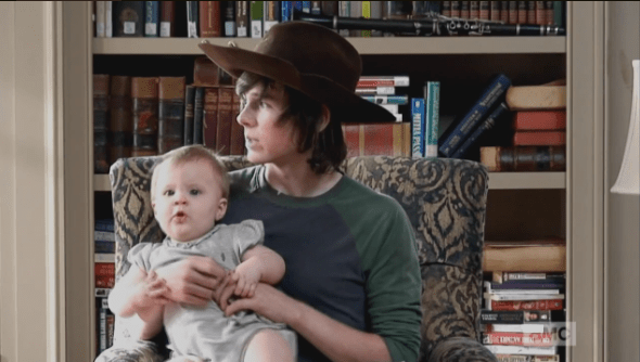 carl and judith recording 1 Published March 9, 2015 at 590 × 334 in The Walking Dead, Season 5, Episode 12, “Remember” Looking around, Carl says that this is the kind of place that his mom wanted for them. It made me think of Lori, and how much she would have loved finding Alexandria, and settling there with her family. So sad. 😦