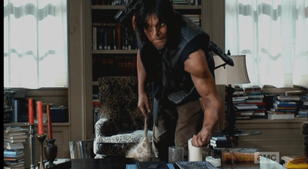 daryl in deanna’s office 1 Published March 8, 2015 at 599 × 329 in The Walking Dead, Season 5, Episode 12, “Remember” Daryl is leaned over, fiddling with some polished stones, or dice, or something on Deanna’s desk. We hear Deanna’s voice, through the recorder, “You’re welcome to sit, Daryl.”