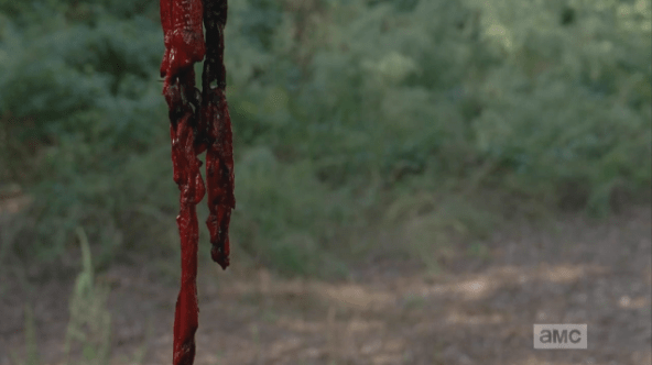 d’oh! Published March 11, 2015 at 592 × 332 in The Walking Dead, Season 5, Episode 12, “Remember” D’oh! Walker’s gone, just a bloody chain with flies buzzing around it.