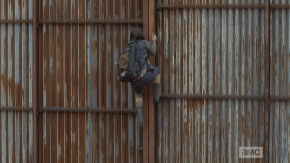 enid goes over the fence Published March 10, 2015 at 586 × 330 in The Walking Dead, Season 5, Episode 12, “Remember” Enid…giving the sneaky look around, then beginning to climb up the fence…she looks like she’s pretty much a pro at it, by now…it’s pretty apparent that she’s done it before, many times.