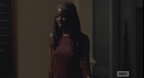 michonne looking all relaxed and cute Published March 8, 2015 at 599 × 323 in The Walking Dead, Season 5, Episode 12, “Remember” I love seeing this side of Michonne, all laughing and girly and cute.