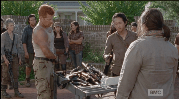 one by one the gang hands over their guns Published March 8, 2015 at 593 × 331 in The Walking Dead, Season 5, Episode 12, “Remember” Deanna tells them they can check out their guns at any time when they go outside the walls…