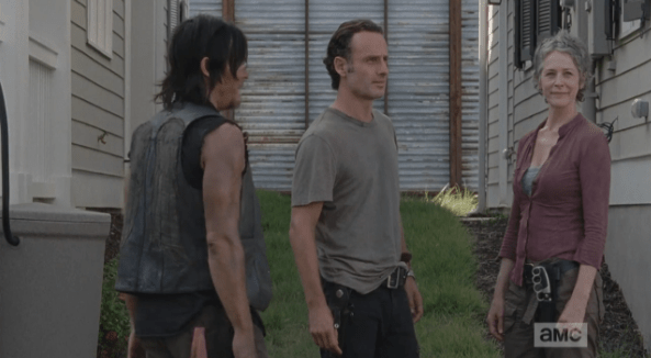 porch yard convene Published March 8, 2015 at 593 × 326 in The Walking Dead, Season 5, Episode 12, “Remember” As Carol grins benignly at a curious passerby, Rick and Daryl try to look casual…just a neighborly yard chat, here. Looking away, Rick informs them that they will all be sleeping in the same house tonight.