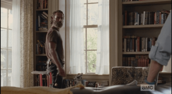 Rick turns to face Deanna. “Rick Grimes,” he offers, before turning away again, looking at the window, the books, the room. I found this interesting, how he would turn away like this, instead to continuing to face, assess Deanna. I guessed maybe he was trying to make himself appear casually indifferent, harder to read, for Deanna.