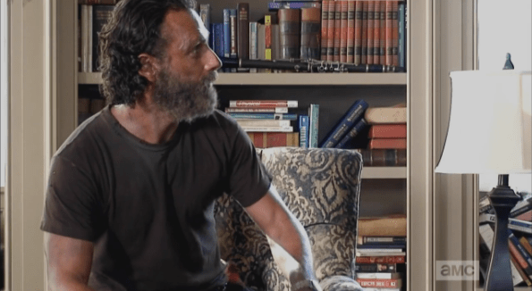 rick sits 2 Published March 7, 2015 at 595 × 326 in The Walking Dead, Season 5, Episode 12, “Remember” Rather than relaxing into the chair, Rick sits on the edge of it, taking a moment more to look off to the side, at something in the room…