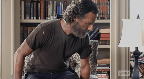I guess it has been a long time since Rick has actually gotten to sit in an actual chair…maybe the last time was in “Claimed,” before the Downstairs Thug Boys found the house and Rick had to escape? Can’t remember an actual house he was in since that time…always has been the ground or a floor these days.