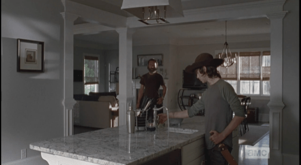 running water Published March 8, 2015 at 599 × 329 in The Walking Dead, Season 5, Episode 12, “Remember” Running water. Carl looks over at his dad in disbelief.