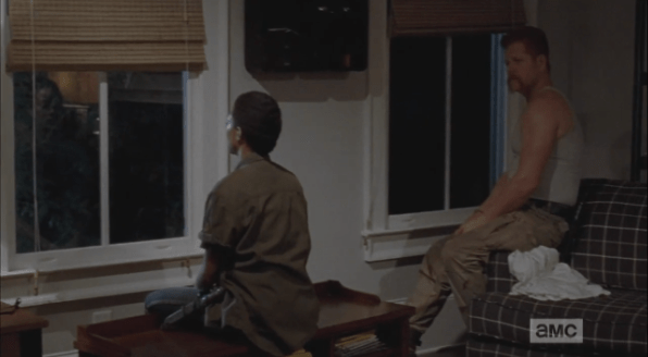 sasha and abraham soc ret Published March 8, 2015 at 596 × 328 in The Walking Dead, Season 5, Episode 12, “Remember” Sasha sits, looking out the window, not talking, while Abraham sits in the corner, sneaking mournful looks over Rosita’s way. Poor guy.